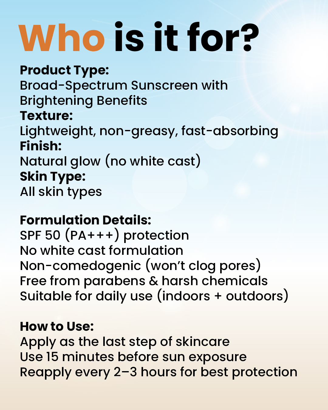 Infused with Vitamin C, it helps brighten the skin, even out tone, and protect against sun-induced dullness and premature aging. The smooth, fast-absorbing formula blends effortlessly without leaving a white cast—perfect for daily use under makeup or on bare skin.